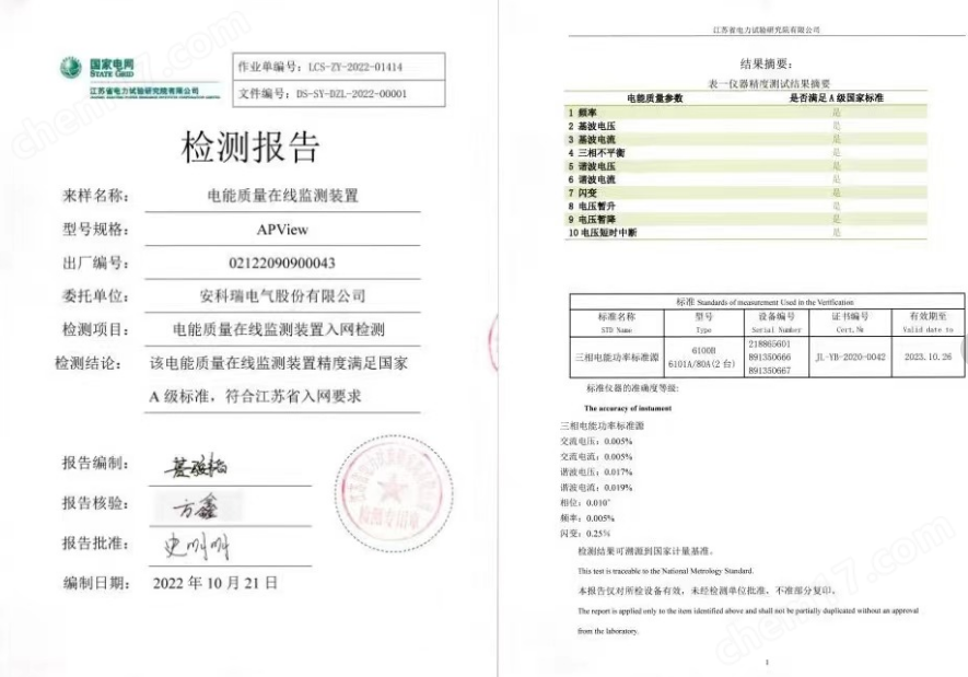APView500電能質量在線監測裝置采用了高性能多核平臺和嵌入式操作系統,遵照 IEC61000-4-30《測試和測量技術-電能質量測量方法》中規定的各電能質量指標的測量方法 進行測量,集諧波分析、波形采樣、電壓暫降/暫升/中斷、閃變監測、電壓不平衡度監測、 事件記錄、測量控制等功能為一體。裝置在電能質量指標參數測量方法的標準化和指標參數 的測量精度以及時鐘同步、事件標記功能等各個方面均達到了 IEC61000-4-30 A *標準,能 夠滿足 110kV 及以下供電系統電能質量監測的要求,廣泛適用于化工、鋼鐵、冶金、醫院、 數據中心、交通建筑等行業的電能質量監測。