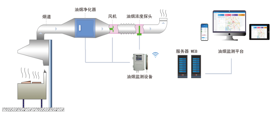 凈化器和風機配合對油煙進行凈化處理,同時對凈化設備的電流進行監測