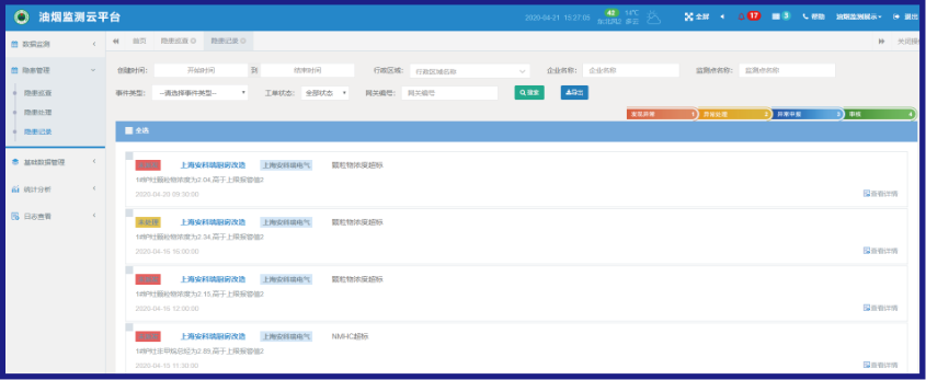 系統對采集的告警數據分析,產生對應的隱患記錄,派發、處理隱患,及時處理告警,形成閉環。