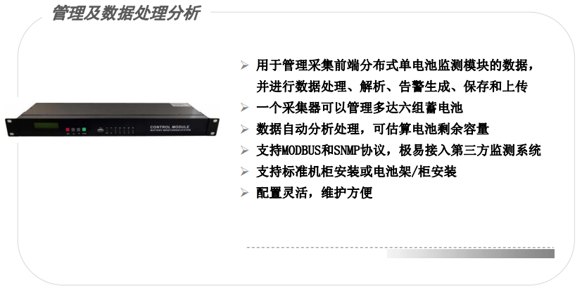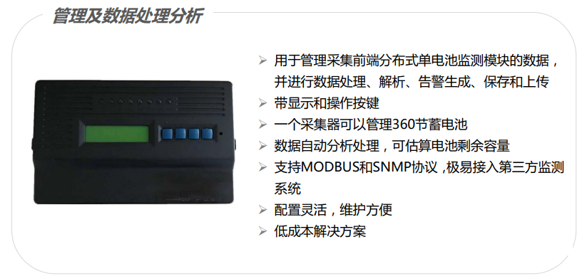 監測每一個蓄電池的電壓,內阻,故障以及節點溫度等狀態。