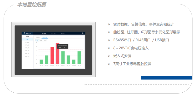 ABAT-D-07觸摸屏作為選配模塊,通過串口或網口連接采集器,實現蓄電池監測系統本地顯控的拓 展。觸摸顯示屏作為7英寸電容觸控屏,采用安卓系統,內置APP,界面清晰,易于操控。可查詢電池監 測系統的實時數據、告警記錄、圖表顯示和事件記錄等相關內容。