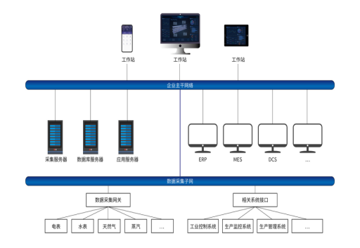 為了幫助企業進行三*能源計量體系的建設,找出低能效的源頭,首先需要勘察、統計和明確企業的行業特性、生產架構、能源流向、主要設備、關鍵工序等,并且將附屬的辦公、食堂、宿舍等納入監測體系,以下是一個工業企業典型的軟硬件架構拓撲圖。