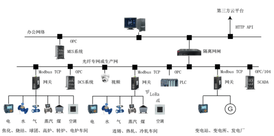 設(shè)備層(鋼鐵廠需要安裝電表、水表、氣表以及其他能源計(jì)量設(shè)備)通過RS485專線或無線通訊。