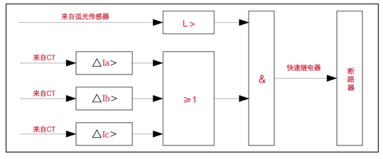 利用微機過流保護實現中低壓開關柜及其母線保護方案。過流保護動作時間需與各饋線過流保護時間配合,*少在300 ms 以上,動作時間不能滿足快速切除弧光短路故障的要求。