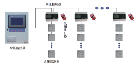 余壓監(jiān)控系統(tǒng)由余壓監(jiān)控器(主機)、余壓控制器、余壓探測器、風閥執(zhí)行器、系統(tǒng)監(jiān)控專用軟件等部分或全部設(shè)備組成,系統(tǒng)組網(wǎng)如下圖所示。